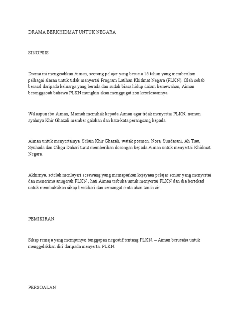 Sinopsis drama berkhidmat untuk negara Tuesday January 25 2022 Edit. Drama ini mengisahkan Aiman seorang pelajar yang berusia 16 tahun yang memberikan pelbagai alasan untuk tidak menyertai Program Latihan Khidmat Negara. Sinopsis Drama Berkhidmat Untuk Negara Aiman menerima sepucuk surat daripada Jabatan Latihan Khidmat Negara untuk menyertai Program Latihan Khidmat Negara PLKN.