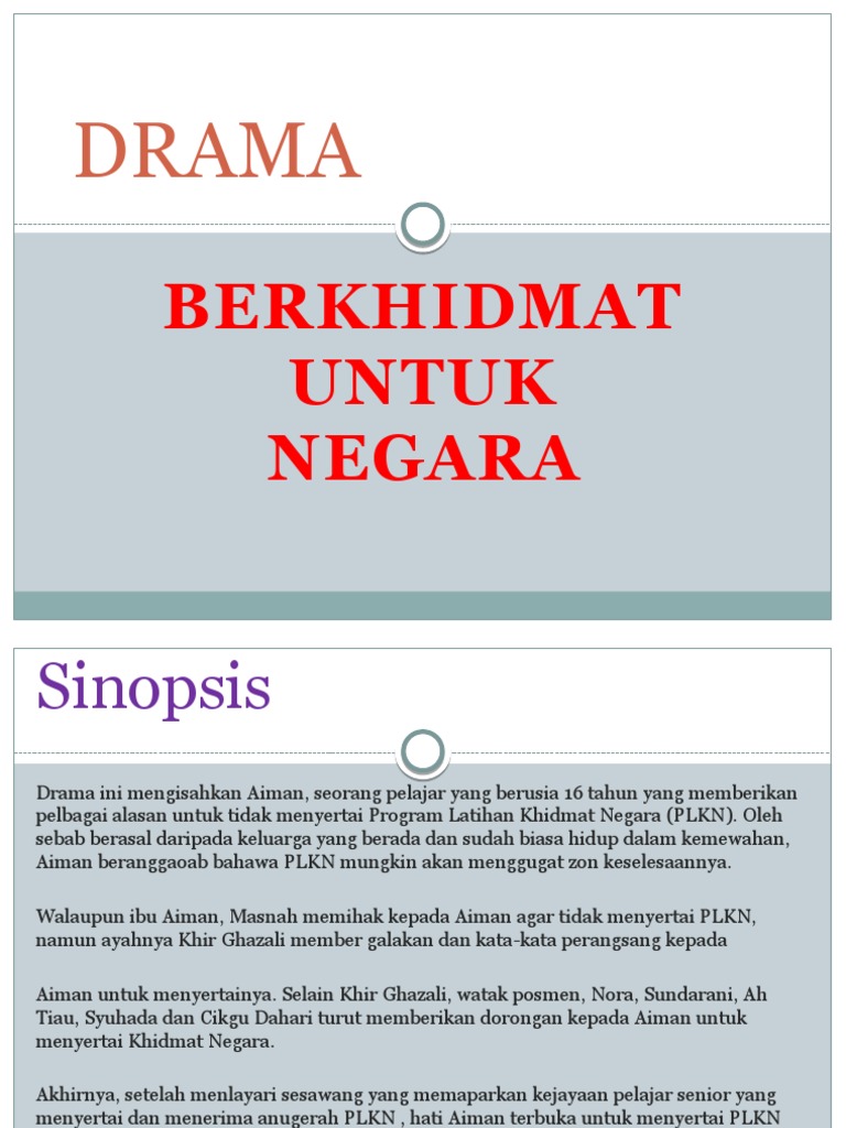 DRAMA BERKHIDMAT UNTUK NEGARA SINOPSIS Drama ini mengisahkan Aiman seorang pelajar yang berusia 16 tahun yang memberikan pelbagai alasan untuk tidak. Sinopsis Pemikiran Persoalan Plot Teknik Plot Watak Perwatakan Latar Tempat Latar Masa Latar Masyarakat Gaya Bahasa Nilai Pengajaran Soalan KBAT. SINOPSIS Drama ini mengisahkan Aiman seorang pelajar yang berusia 16 tahun yang memberikan pelbagai alasan untuk tidak menyertai Program Latihan Khidmat.